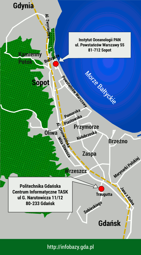 Konferencja odbędzie się w dwóch lokalizacjach: w Gdańsku w gmachu NE Wydziału ETI na Politechnice Gdańskiej oraz w Sopocie w Instytucie Oceanologii PAN. W obu lokalizacjach znajdują się nowoczesne sale wykładowo-konferencyjne z pełnym wyposażeniem multimedialnym.